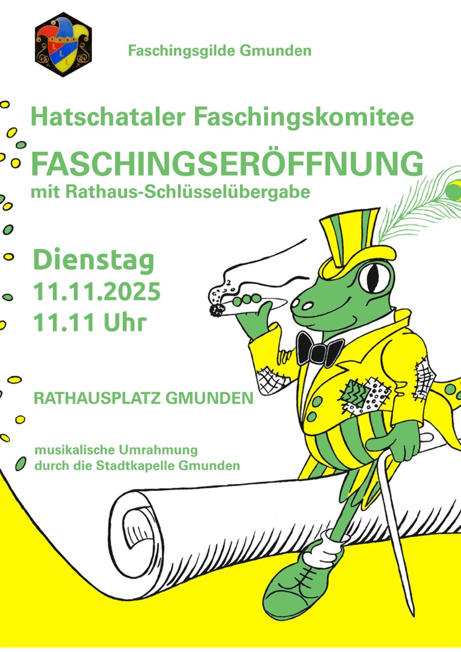 Das Hatschataler Faschingskomitee und die Faschingsgilde Gmunden laden gemeinsam mit der Stadtgemeinde Gmunde zur Faschingseröffnung am Dienstag, 11.11.2025 um 11.11 Uhr